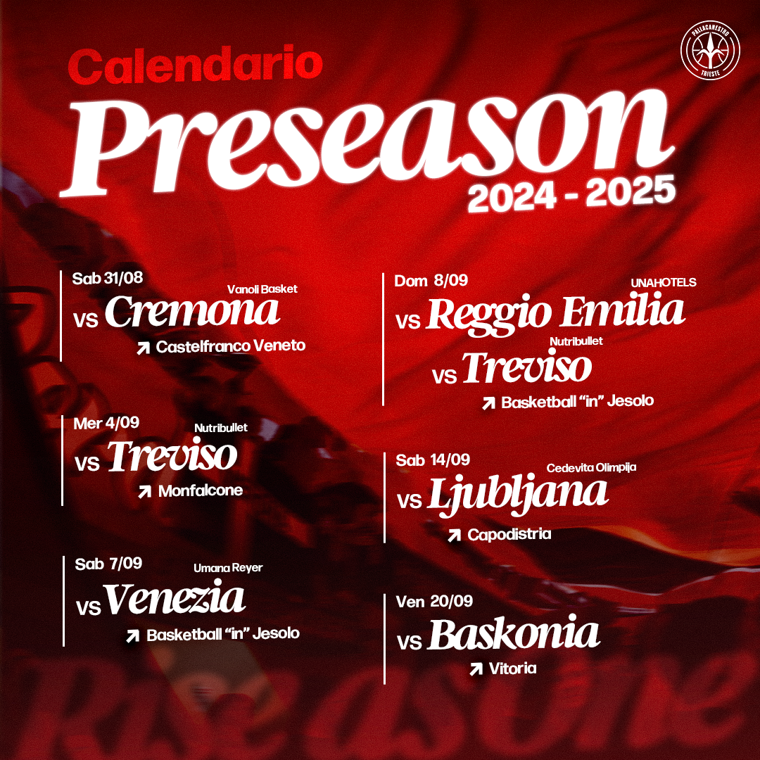 Gli impegni di pre-season della Pallacanestro Trieste inizieranno sabato 31 agosto in quel di Castelfranco Veneto con la prima amichevole estiva con la Vanoli Basket Cremona.